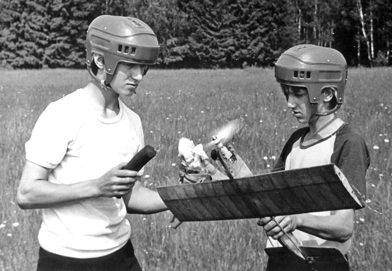 Фото 2. Пилот Сергей Дещеня (слева) и механик Дмитрий Гуднев готовят к старту модель самолета для воздушного боя. 38-е областные соревнования авиамоделистов-школьников. Могилев. 1987 г.