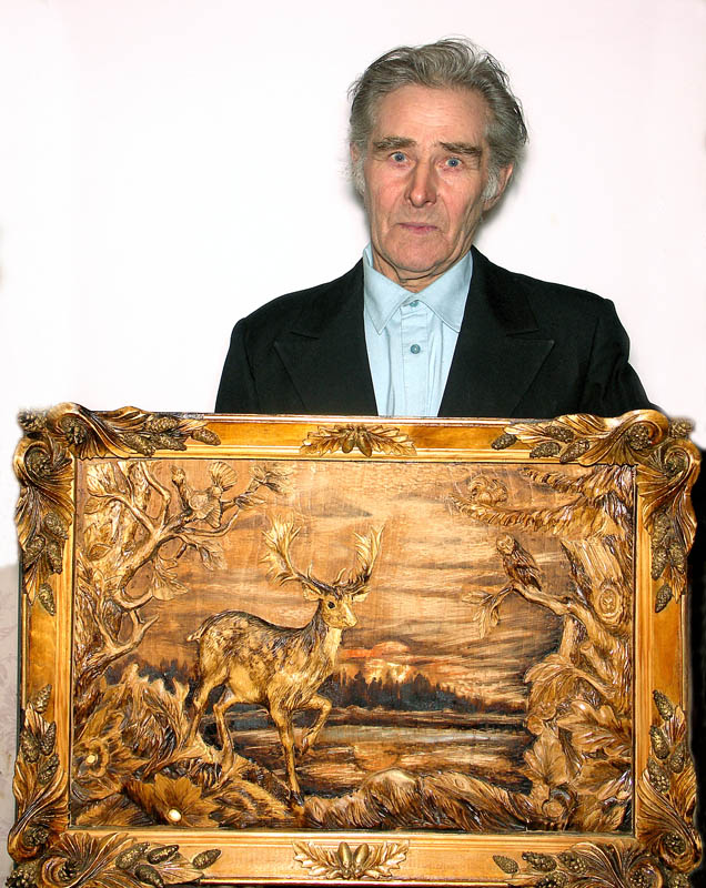 Н. Ячменьков со своей работой “Бегущий олень” (резьба по дереву, 1986 г.). Январь 2006 г.